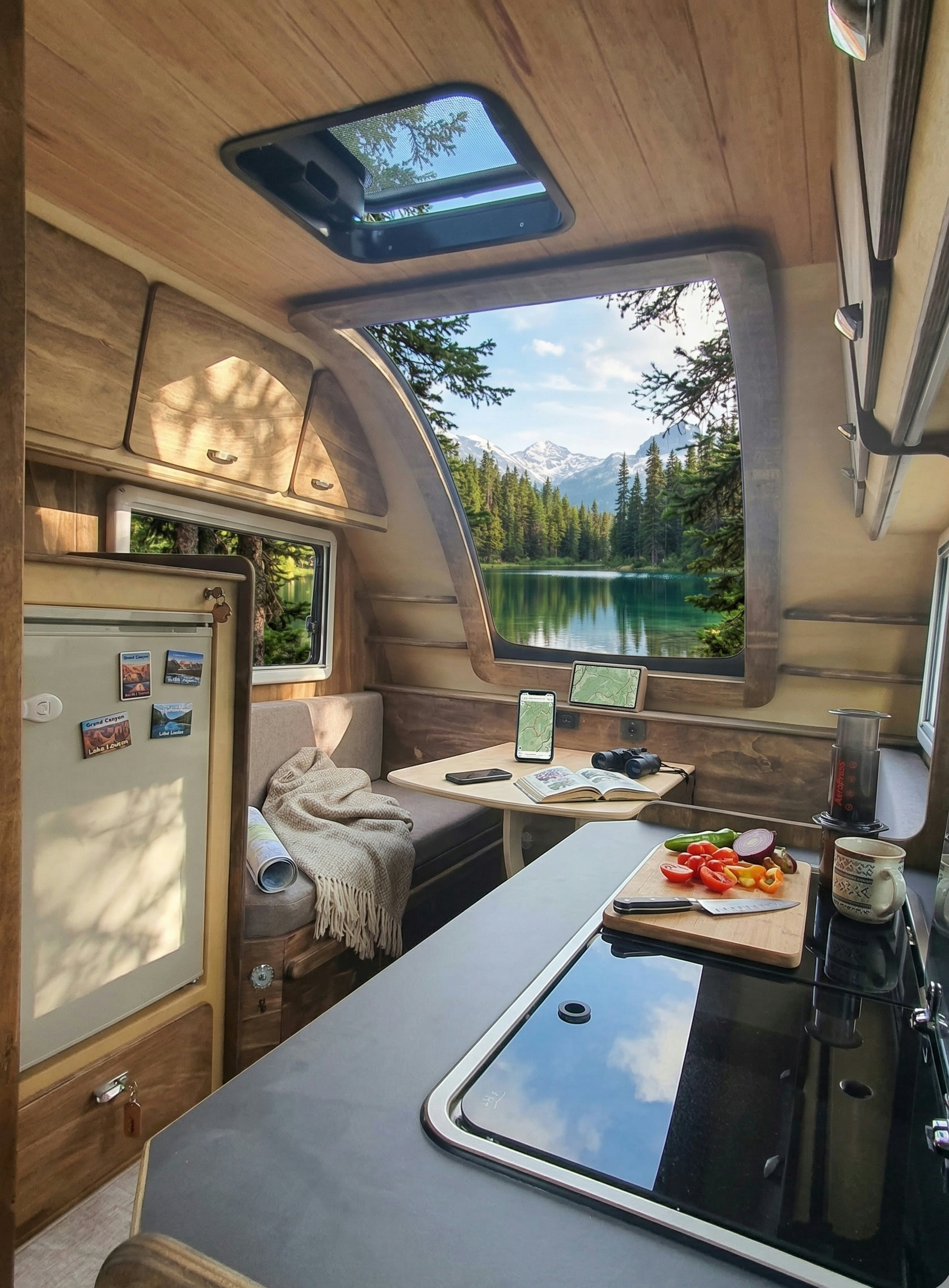 PUSAT, 420 cm gövde uzunluğu ve 215 cm toplam genişliğiyle taşınabilirliği korurken iç mekânda dört kişilik kullanımı mümkün kılan dengeli bir kurgu sunar. Panoramik ön cam, temperli yüzeyler ve termal güneşlik çözümü yalnızca estetik değil, kullanım güveni de üretir.