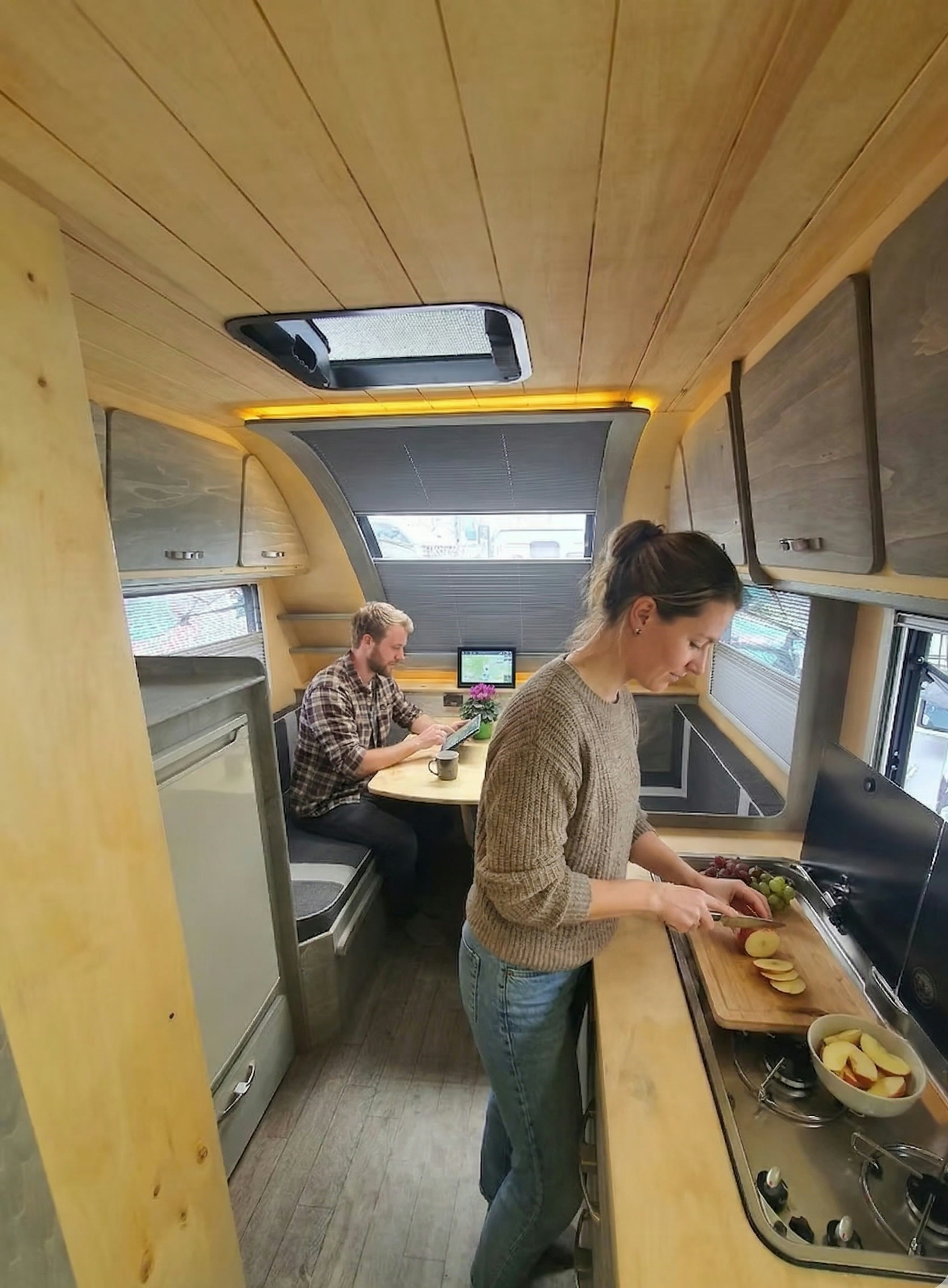 PUSAT'ın dört kişilik masa ve oturma grubu, gece modunda iki kişilik ana yatağa dönüşür. Yan taraftaki ranza sistemi ile aynı hacim içinde dört kişilik konaklama çözülür; bu da küçük gövdede gerçek kullanım verimliliği sağlar.